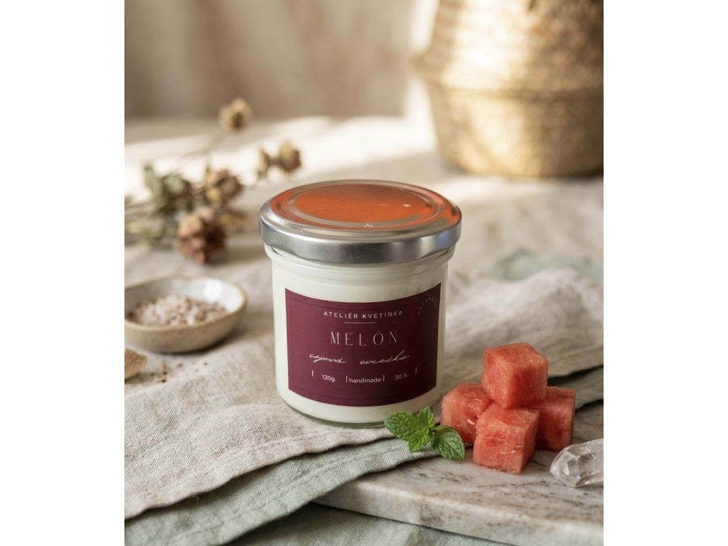 Základom tejto sviečky je náš overený 100% prírodný sójový vosk obohatený o čisto prírodné esenciálne oleje. Tie zaručujú autentickú ovocnú vôňu bez syntetických stôp. Klasický bavlnený knôt sa stará o jasný plameň a rovnomerné rozvoňanie vosku, vďaka čomu sa sladká melónová aróma rozšíri po miestnosti jemne a prirodzene.