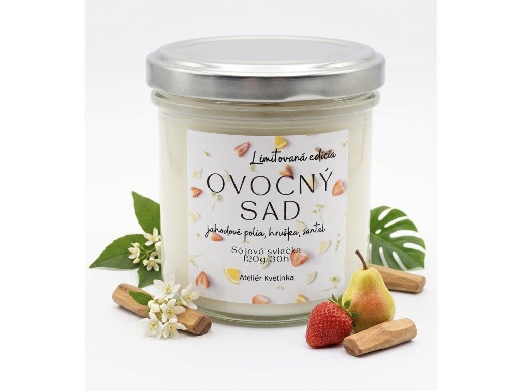 Objavte eleganciu ukrytú v ovocí. Limitovaná sójová sviečka Ovocný sad prináša unikátne spojenie jahôd, hrušky a hrejivého santalového dreva pre pokojnú a útulnú atmosféru vášho domova.