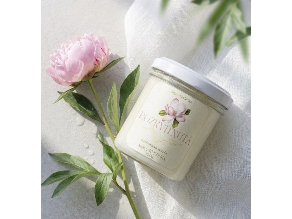 Sójová sviečka ROZKVITNUTÁ (Limitovaná edícia) – Magnólia, pivonka a bavlna
